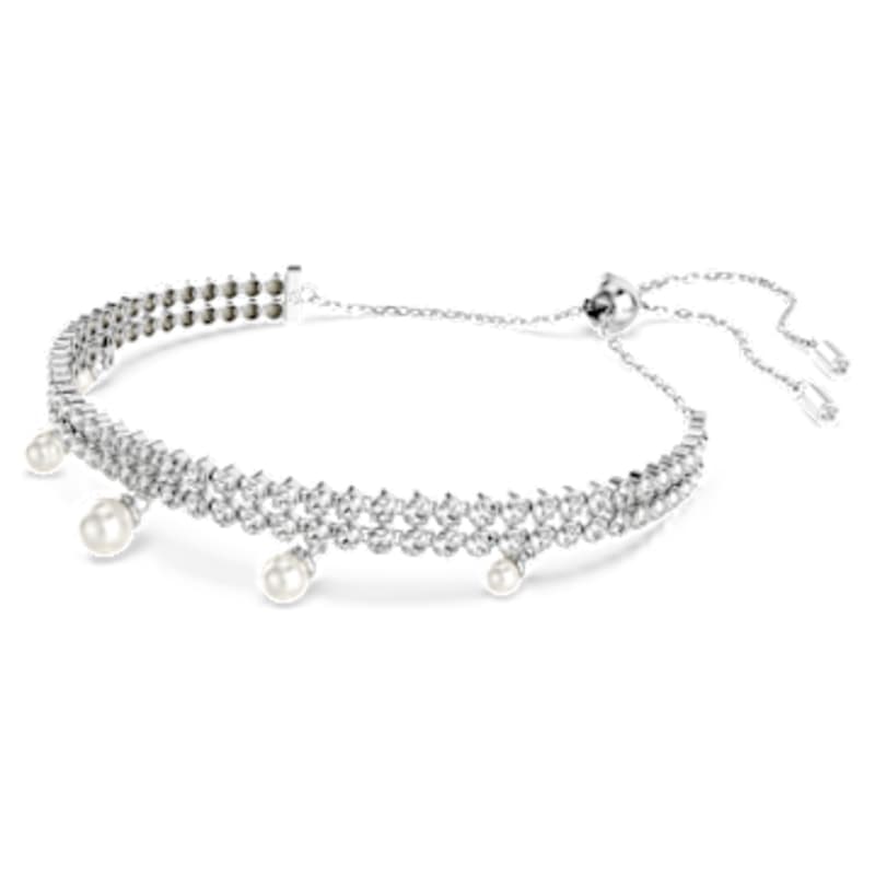 Découvrez la quintessence de l’élégance avec ce bracelet raffiné. Facilement ajustable grâce à son fermoir à boule coulissant, ce design en métal rhodié présente deux rangées de cupchain, serties de Swarovski Zirconia taille ronde incolores. Des Crystal Pearls de Swarovski sont suspendues, pour un look sensationnel et luxueux. Associez ce bracelet au choker assorti et créez votre propre combinaison expressive.