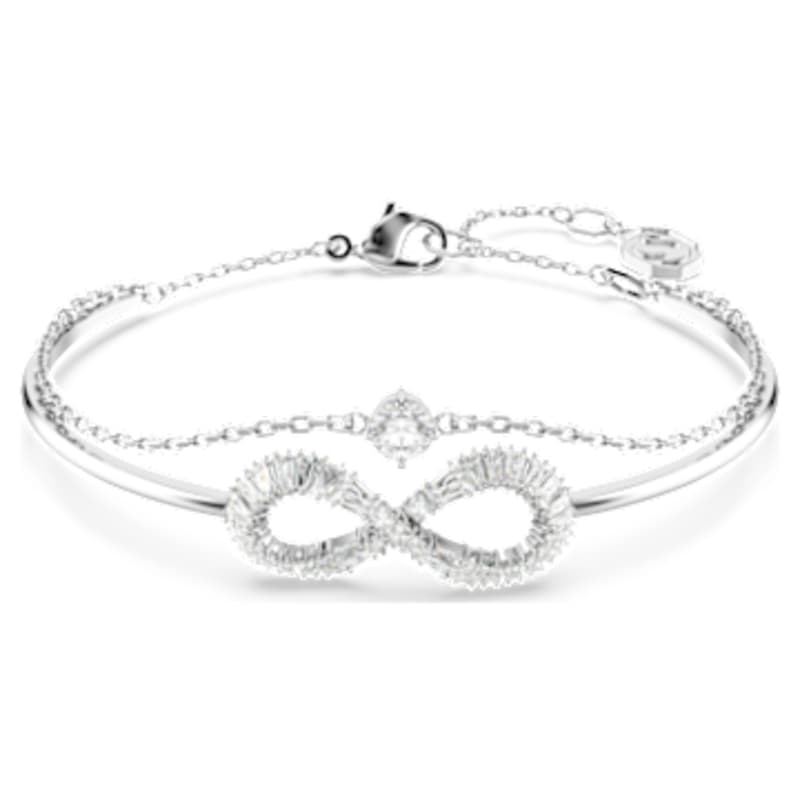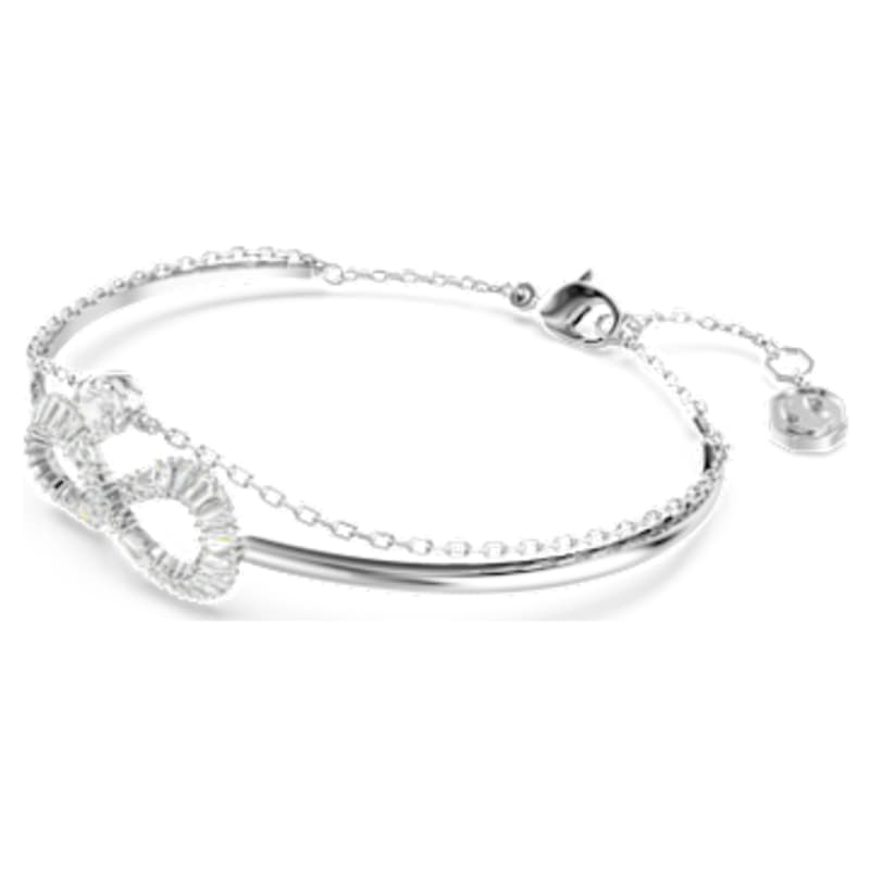 Vous ne vous lasserez pas du charme versatile de cet éclatant bracelet-jonc Hyperbola. Son design en métal rhodié se compose d’un anneau rigide avec un délicat motif de l’infini orné de Swarovski Zirconia incolores. Une seconde chaîne est également ajoutée, ponctuée d’un unique Swarovski Zirconia rond serti en son centre. Un magnifique bracelet-jonc double qui vous accompagnera sans effort, de jour comme de nuit.