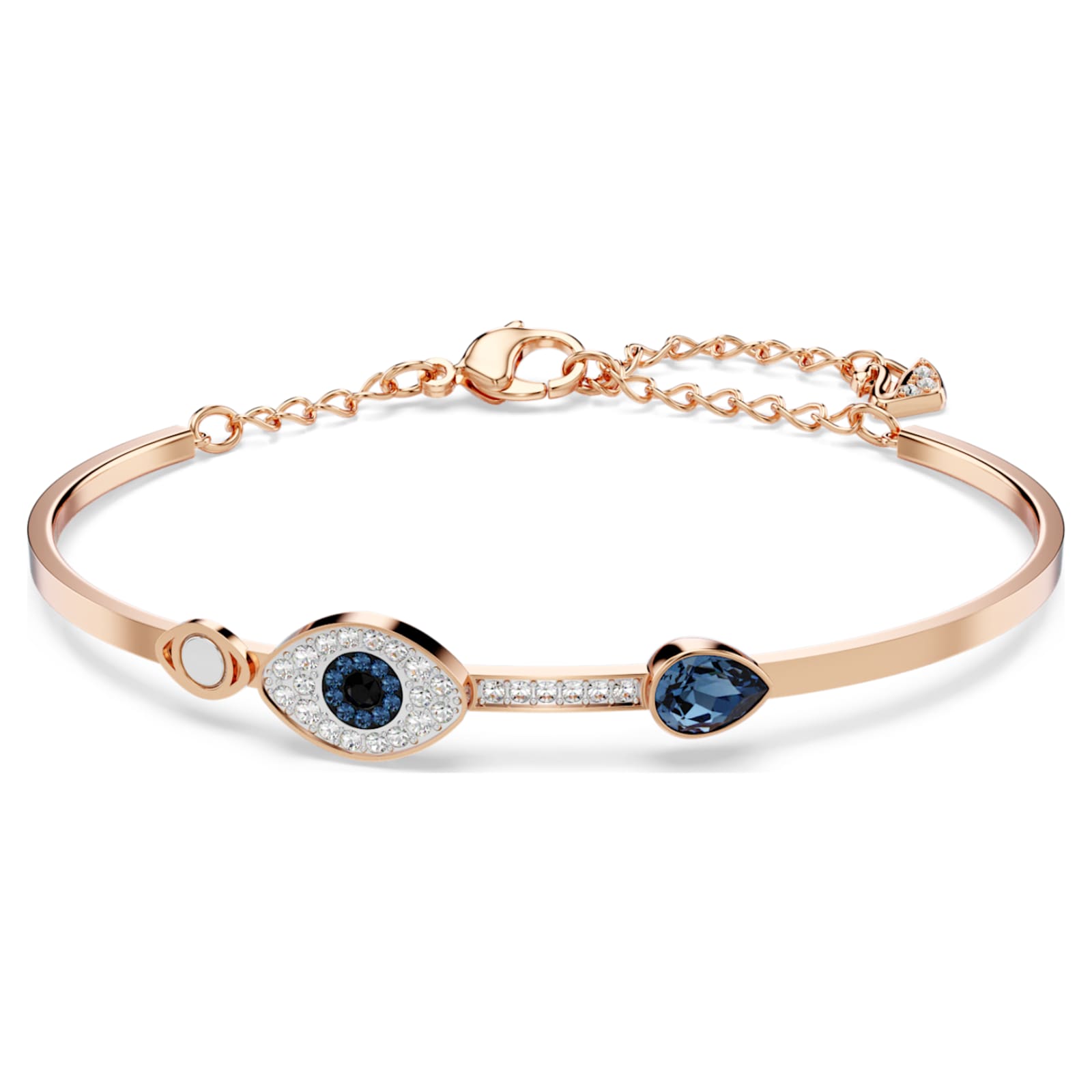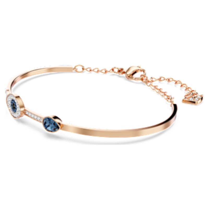 Ce sensationnel bracelet-jonc, présentant un mélange de métaux plaqués, offre un contraste saisissant entre le métal doré rose, les cristaux sertis pavé et les cristaux bleus. Affichant deux yeux et une goutte en cristal bleu, il est doté d’un fermoir réglable pour une tenue sécurisée. Coordonnez-le avec d’autres bracelets-joncs pour un look tendance.