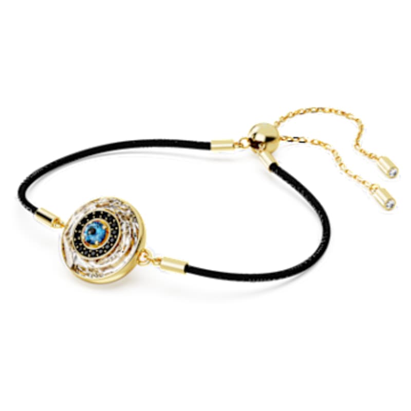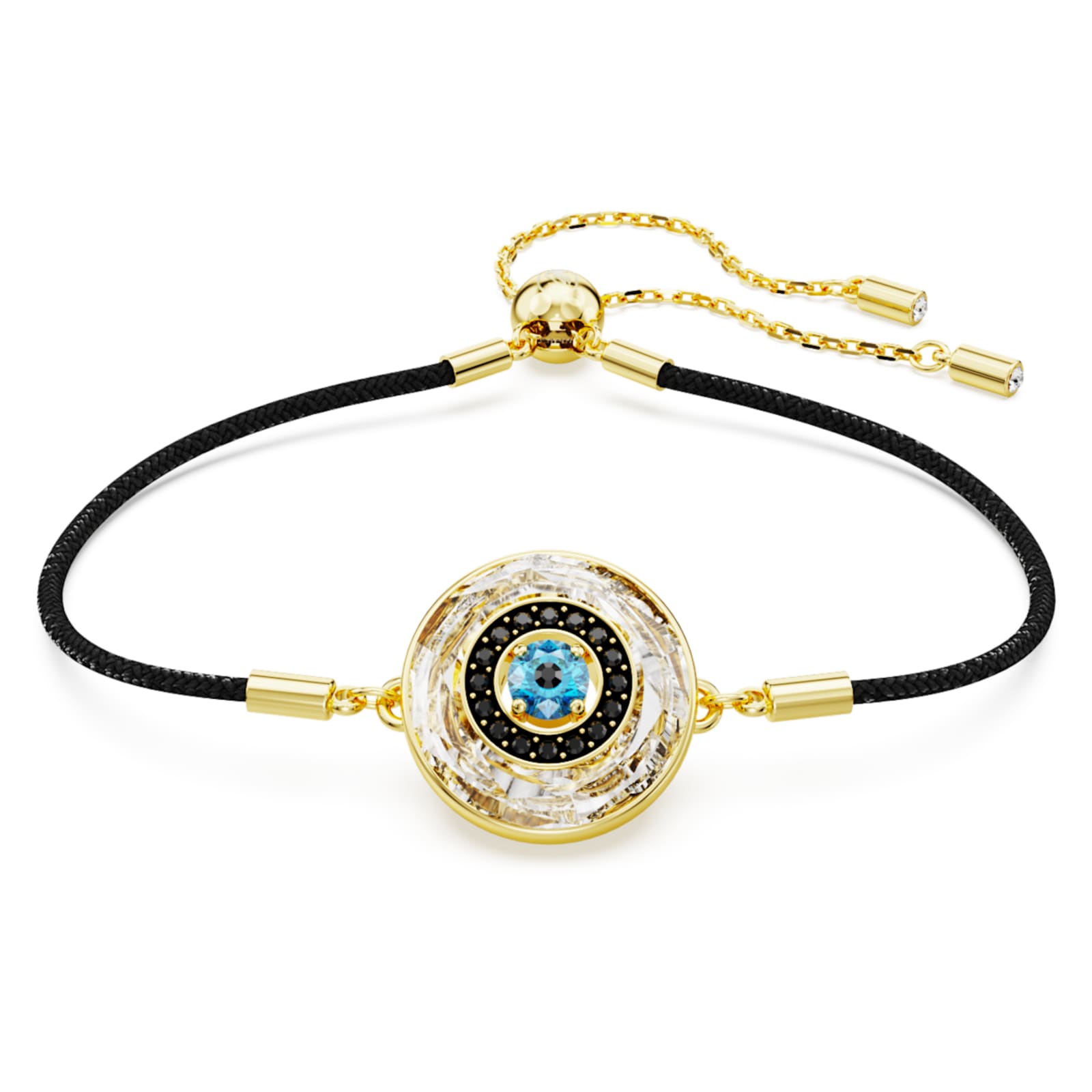 Ce bracelet Symbolica est empreint d’énergie positive. Ce bijou de ton or, sur un cordon noir à fermoir coulissant, met superbement en valeur la créativité inégalée de Swarovski. Son motif du mauvais œil se compose d’un anneau externe facetté, d’un pavé noir et d’une pierre bleue centrale. Une pièce lumineuse aussi symboliqueque fascinante.