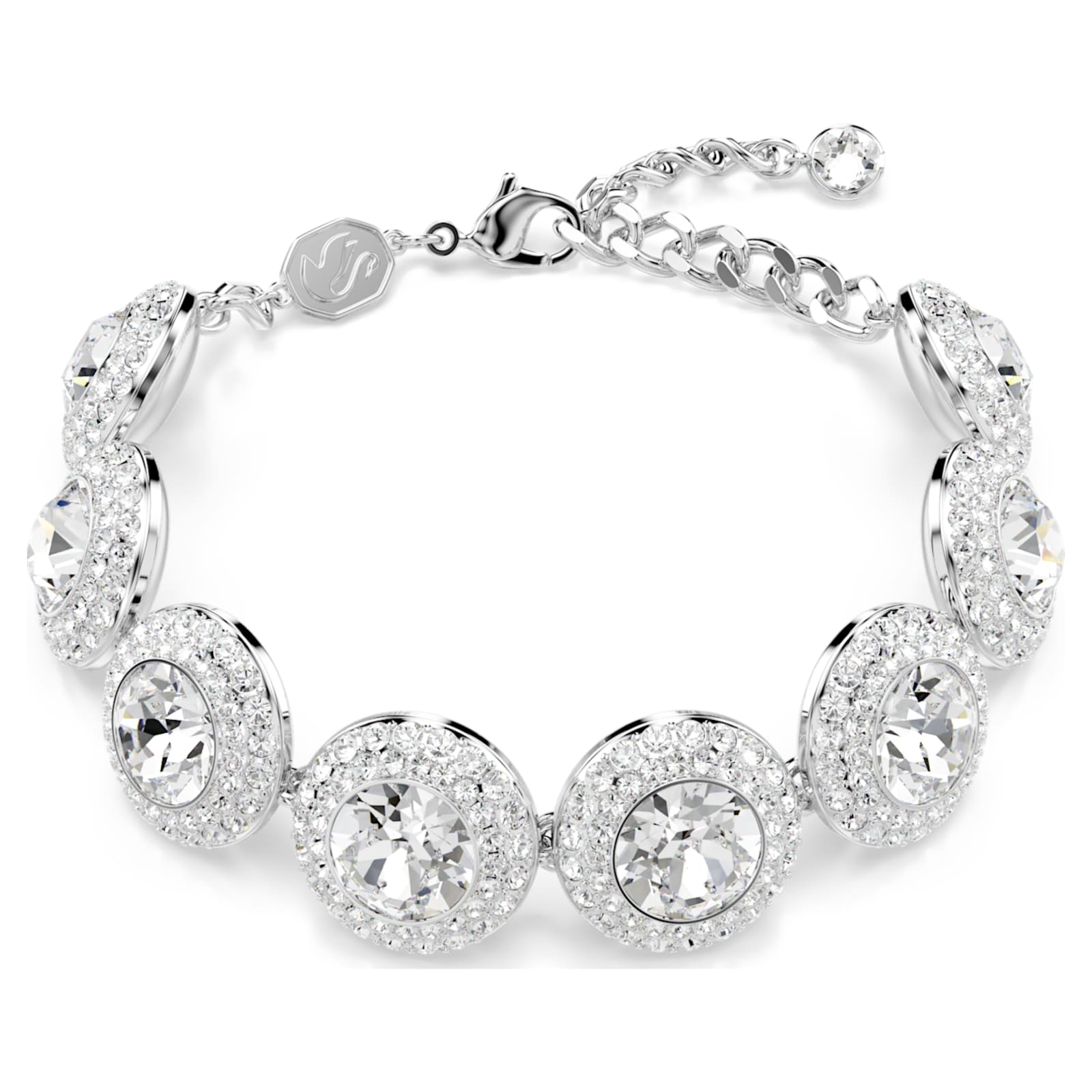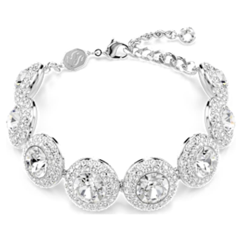 Enveloppez votre poignet de la luminosité merveilleuse de ce bracelet Swarovski. La chaîne en métal rhodié est dotée d’un fermoir mousqueton et ornée d’une rangée d’anges symboliques. Associez-le à d’autres pièces Una Angelic pour un look éclatant.