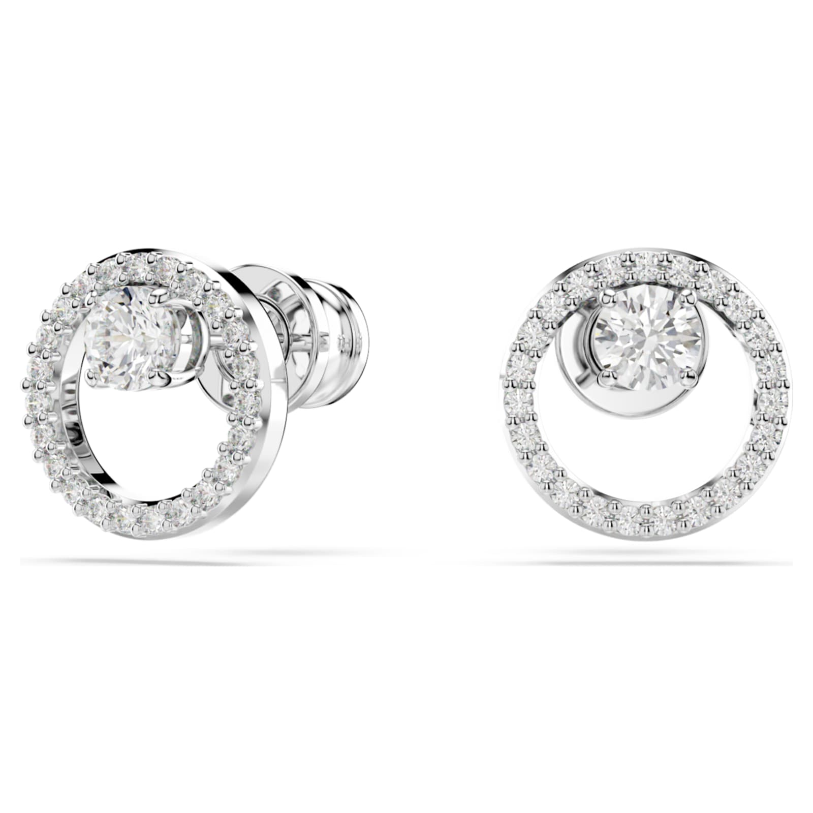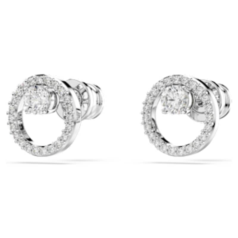 Ces clous circulaires raffinés sont empreints d’une élégance intemporelle. Chaque pièce percée en métal rhodié affiche un anneau pavé central en Swarovski Zirconia incolores et un unique Swarovski Zirconia serti griffes en son centre. Accentuez leur effet en les associant avec un pendentif Constella assorti.