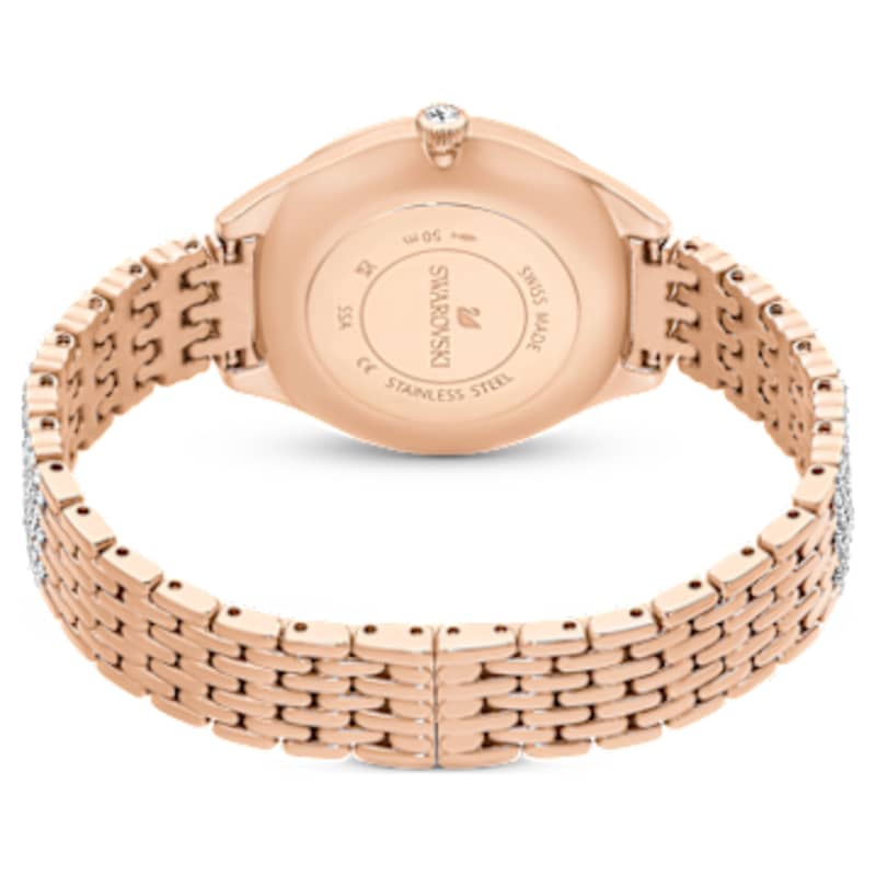 Cette montre contemporaine et raffinée de 30 mm dévoile une finition de ton or rose et pas moins de 433 cristaux étincelants. Son cadran argenté élégant est enrichi d’un motif guilloché et de cristaux servant de marqueurs sur l’index, tandis que sa lunette fine et son bracelet sont tous deux ornés de leur propre pavage de cristaux incolores éblouissants. Étanche jusqu’à 50 m, cette montre fabriquée en Suisse également ornée d’une seule pierre placée dans sa couronne accesoirisera à merveille tous vos looks, de jour comme de nuit.
