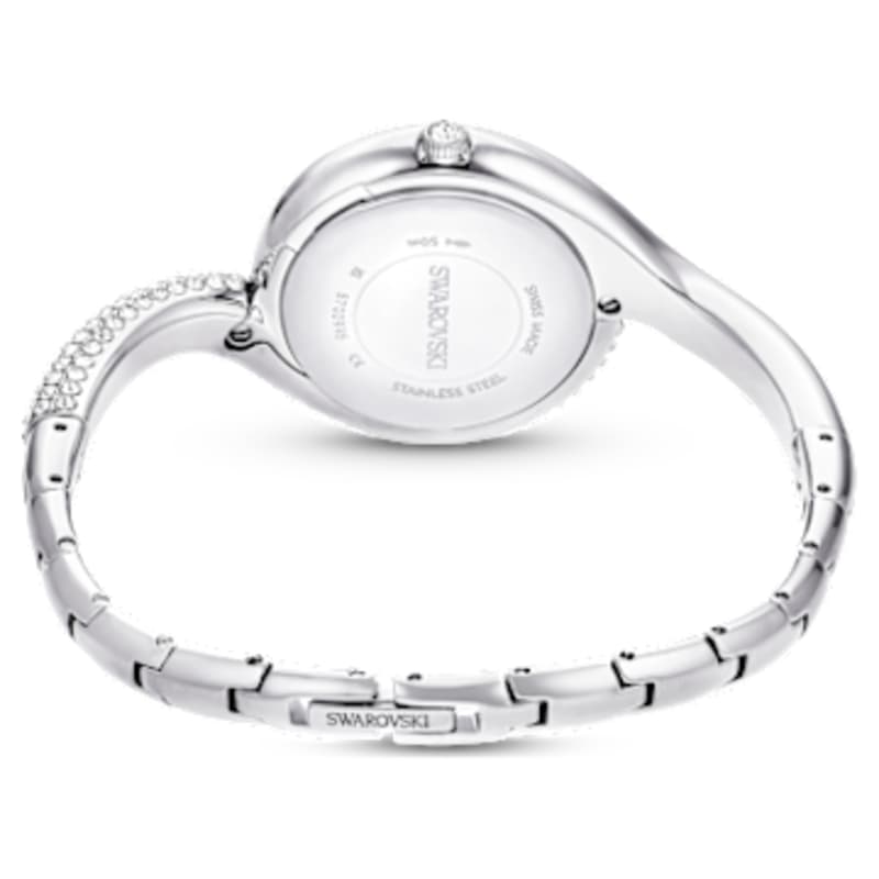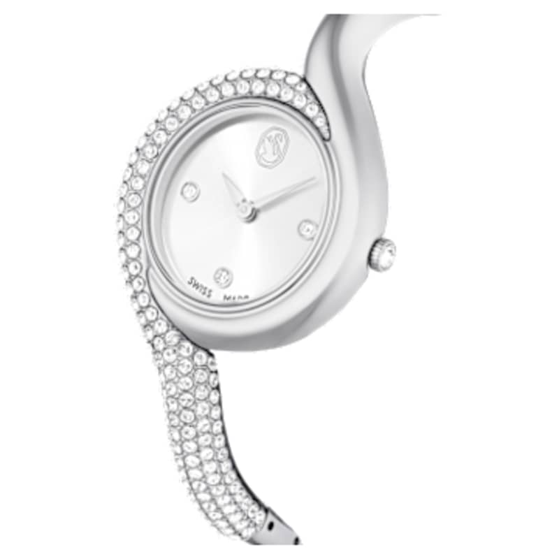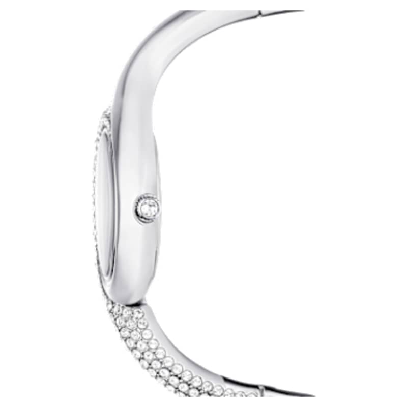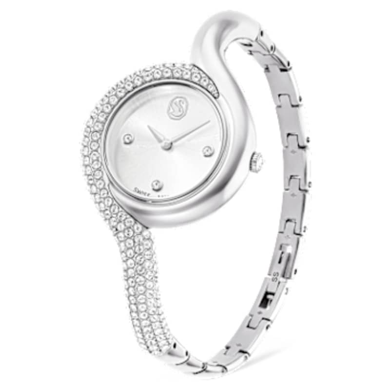 Cette montre Dextera captivante s’inspire des montres classiques d’une époque vintage. Ce design en acier inoxydable de 29 mm est orné avec créativité d’un pavé de cristaux incolores sur la moitié de la lunette et la moitié du bracelet. Le cadran minimaliste présente un effet soleillé et est rehaussé uniquement de trois index en cristal et du logo cygne à midi. Au total, 203 cristaux ont été utilisés pour la création de cette montre, dont un unique cristal placé à l’intérieur de la couronne. Swiss made, elle est étanche jusqu’à 50 mètres et incarne à la perfection la sophistication Swarovski.