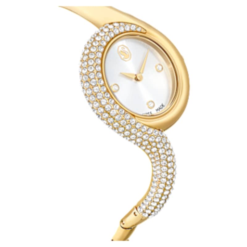Cette montre Dextera captivante s’inspire des montres classiques d’une époque vintage. Ce design en acier inoxydable de 29 mm présente une finition ton or et est orné avec créativité d’un pavé de cristaux incolores sur la moitié de la lunette et la moitié du bracelet. Le cadran minimaliste présente un effet soleillé et est rehaussé uniquement de trois index en cristal et du logo cygne à midi. Au total, 203 cristaux ont été utilisés pour la création de cette montre, dont un unique cristal placé à l’intérieur de la couronne. Swiss made, elle est étanche jusqu’à 50 mètres et incarne à la perfection la sophistication Swarovski.