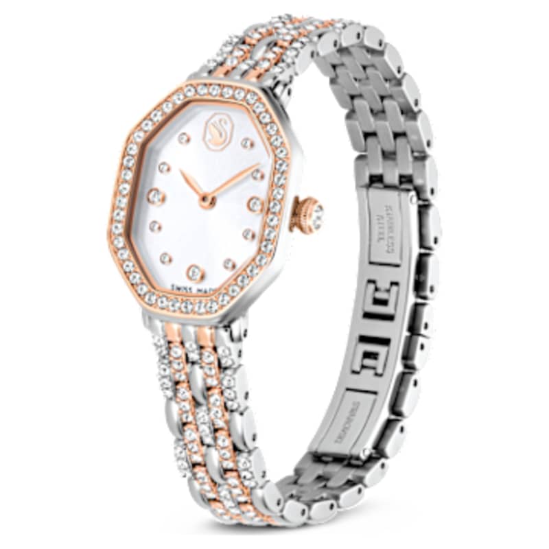 Inspirée par l’élégance intemporelle de la famille Dextera, cette montre de 18 x 23 mm est une création unique réalisée dans la forme octogonale iconique de Swarovski. Associant acier inoxydable et finition de ton or rosé, le design présente une lunette pavée sertie de 46 cristaux, ainsi qu’un cristal supplémentaire serti dans la couronne. Le cadran soleillé comprend également de délicats index en cristal, ainsi que des aiguilles effilées et un logo cygne à 12 heures. Pour compléter cette brillante création, le bracelet à cinq maillons est orné de 108 cristaux de taille ronde, vous offrant des reflets chatoyants à chaque heure. Cette montre Swiss Made est étanche jusqu’à 50 mètres.