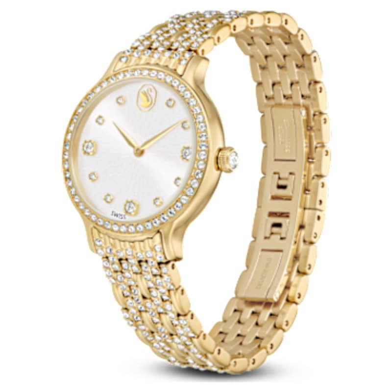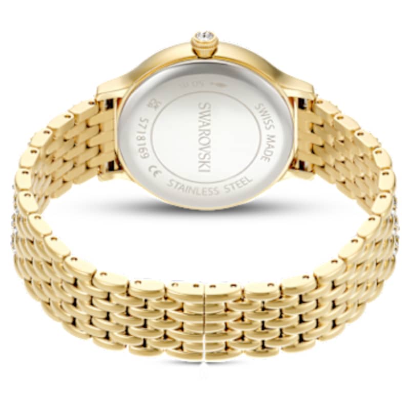 Ornée de 232 cristaux, cette montre Imber scintillante est la plus belle expression de l’élégance intemporelle de Swarovski. Ce design en acier inoxydable de 31 mm présente une finition de ton or et est doté d’une lunette pavée sertie de 52 cristaux incolores, tandis qu’un cristal supplémentaire est également disposé à l’intérieur de la couronne. Sur le cadran soleillé, 11 cristaux de petites et grandes dimensions marquent les heures, accompagnés d’un logo cygne à midi. Autour du poignet, la caractéristique la plus distinctive de la montre est le bracelet ajustable à sept maillons, magnifiquement serti de 168 cristaux taille ronde. Swiss Made, cette montre est étanche jusqu’à 50 mètres et s’accorde parfaitement avec la sélection de bijoux Imber de Swarovski.