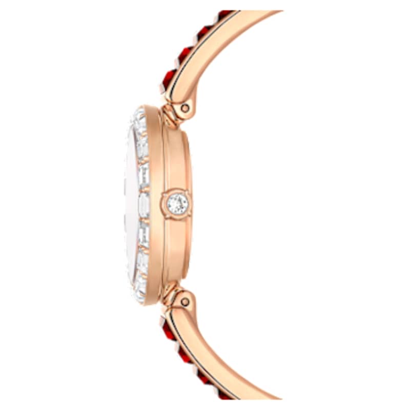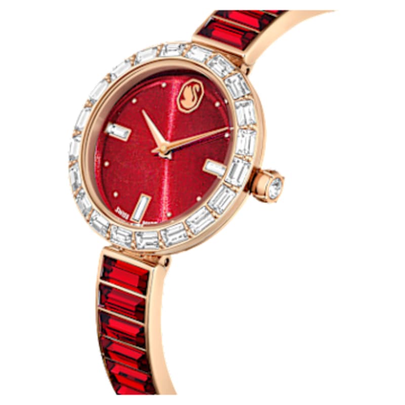 L’élégance est sublimée par les cristaux dans cette magnifique montre inspirée des bijoux. Ce design en acier inoxydable de 25 mm arbore une finition de ton or rose et est entouré d’une lunette sertie de 20 cristaux taille baguette incolores, tandis qu’un cristal unique est incrusté dans la couronne. Des cristaux taille baguette mettent en valeur trois index sur le cadran rouge, qui affiche également un logo cygne à midi. Autour du poignet, le bracelet de style jonc est orné de 16 cristaux rouges taille baguette et est entièrement ajustable pour un confort optimal. Cette montre Swiss made est étanche jusqu’à 50 mètres et constitue l’accessoire idéal pour une occasion spéciale.