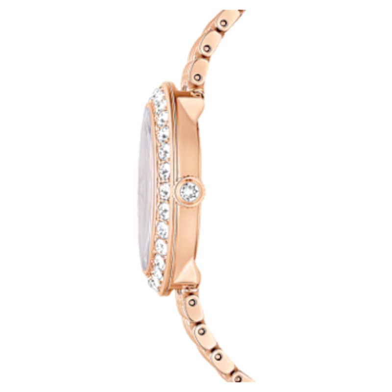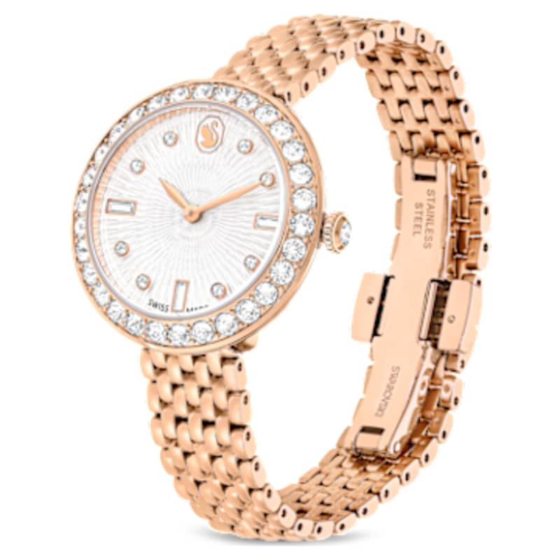 Cette montre Matrix affiche un style contemporain qui célèbre avec brio le savoir-faire emblématique de Swarovski. Son boîtier rond de 30 mm habillé d’un superbe placage de ton or rosé comprend une lunette sertie d’un pavé de 30 cristaux. Le verre minéral protège un fascinant cadran guilloché orné du logo cygne de Swarovski à midi et d’index créés avec des cristaux ronds et baguette. La couronne de la montre est également sertie d’un cristal unique. Pour une touche élégante autour du poignet, cette montre dévoile un bracelet à sept maillons doté d’une finition avec placage de ton or rosé. Cette montre Swiss Made, étanche à 50 m, vous permet d’être à l’heure à tout moment de la journée en restant subtilement sophistiquée.