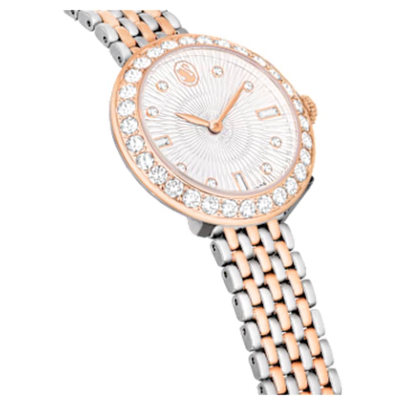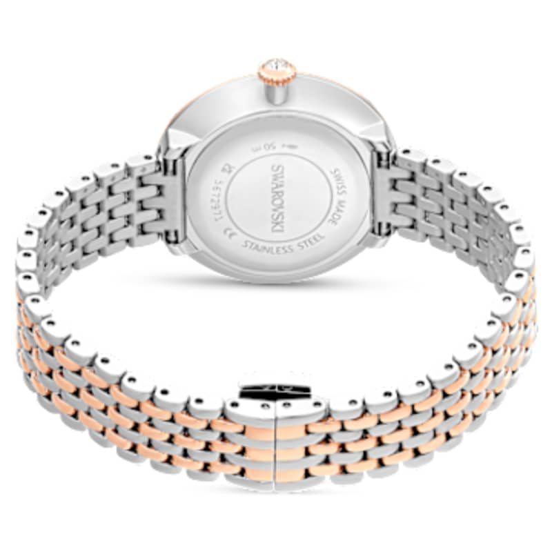 Cette élégante montre Matrix affiche un style contemporain dans les moindres détails. Son boîtier rond de 30 mm habillé d’un superbe placage de ton or rosé comprend une lunette sertie d’un pavé de 30 cristaux. Le verre minéral protège un fascinant cadran guilloché orné du logo cygne de Swarovski à midi et d’index créés avec des cristaux ronds et baguette. La couronne de la montre est également sertie d’un cristal unique. Pour une touche élégante autour du poignet, cette montre est ponctuée d’un bracelet bicolore à sept maillons. Cette montre Swiss Made, étanche à 50 m, vous permet d’être à l’heure à tout moment de la journée en restant subtilement sophistiquée.