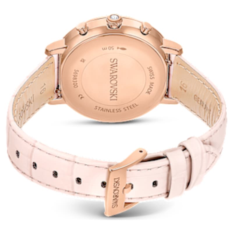 S’inspirant de la forme emblématique des bijoux Matrix Tennis de Swarovski, cette montre chronographe séduit par son élégance et ses cristaux. Ce design de 36 mm en acier inoxydable à la finition de ton or rose est sublimé par un pavé de 48 cristaux incolores sur la lunette. Sublimant la pièce, le cadran rose est rehaussé d’un motif guilloché, de cristaux ronds en guise d’index et arbore un raffiné logo cygne. Trois compteurs complètent les fonctions du chronographe, pour compter séparément les heures, les minutes et les secondes. Le bracelet en cuir de veau rose, doté d’un motif crocodile gaufré et d’un système d’attache rapide, offre un confort optimal sur le poignet. Swiss made, cette montre est étanche jusqu’à 50 mètres et ornée d’un unique cristal sur la couronne. Associez-la aux bijoux de la famille Matrix Tennis pour un look harmonieux.