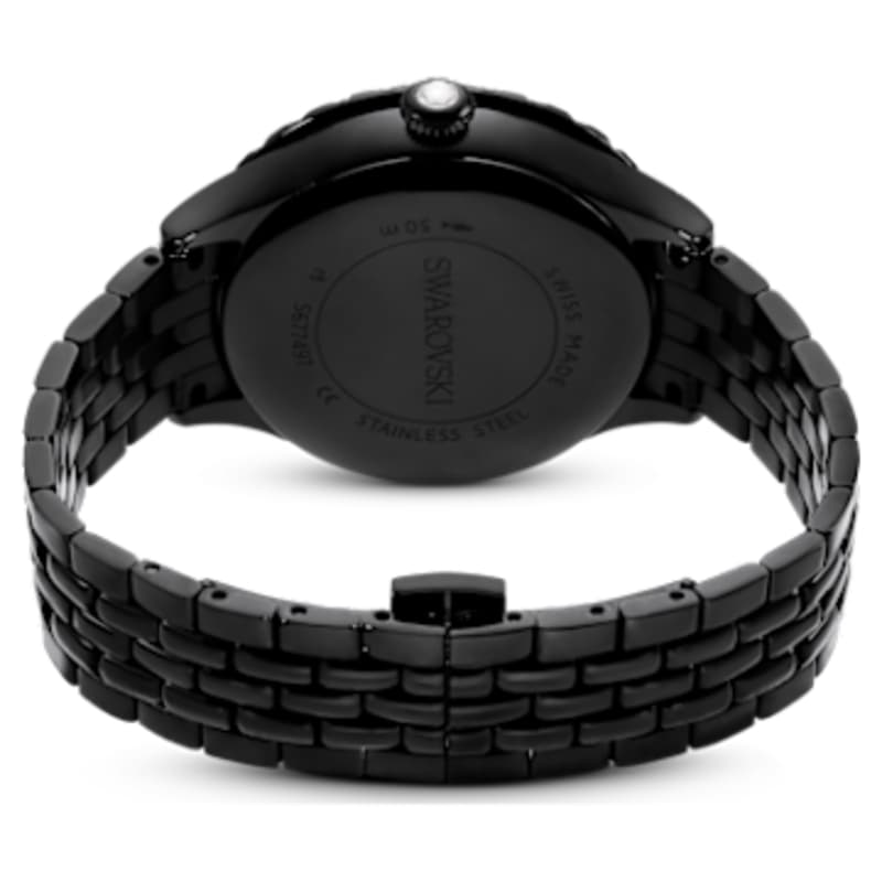 En hommage au 55e anniversaire du premier alunissage, cette montre Octea célèbre de manière exquise le temps qui passe au cycle lunaire. Son boîtier en métal de 37 mm présente une finition noire et est surmonté d’une lunette facettée de cristaux noirs, accompagnée d’un anneau intérieur au pavé scintillant. Son cadran noir est magnifiquement orné de 11 cristaux taille ronde représentant un cosmos étoilé. Quatre index en cristal sont quant à eux disposés au niveau des quarts d’heure. La fonction captivante de phase lunaire est située au-dessus des aiguilles Luminova, tandis que l’élégant logo cygne est positionné à 6 heures. Autour du poignet, cette montre dispose d’un bracelet à multiples maillons avec une finition noire. Cette montre Swiss Made, étanche à 50 m, brille par son savoir-faire éclatant et son charme intergalactique.