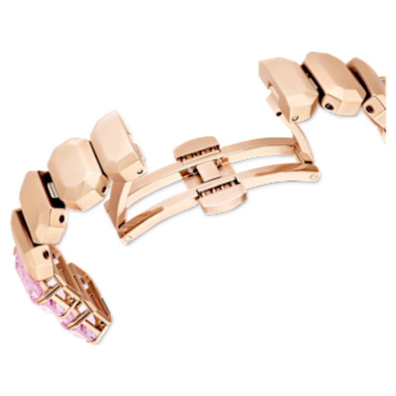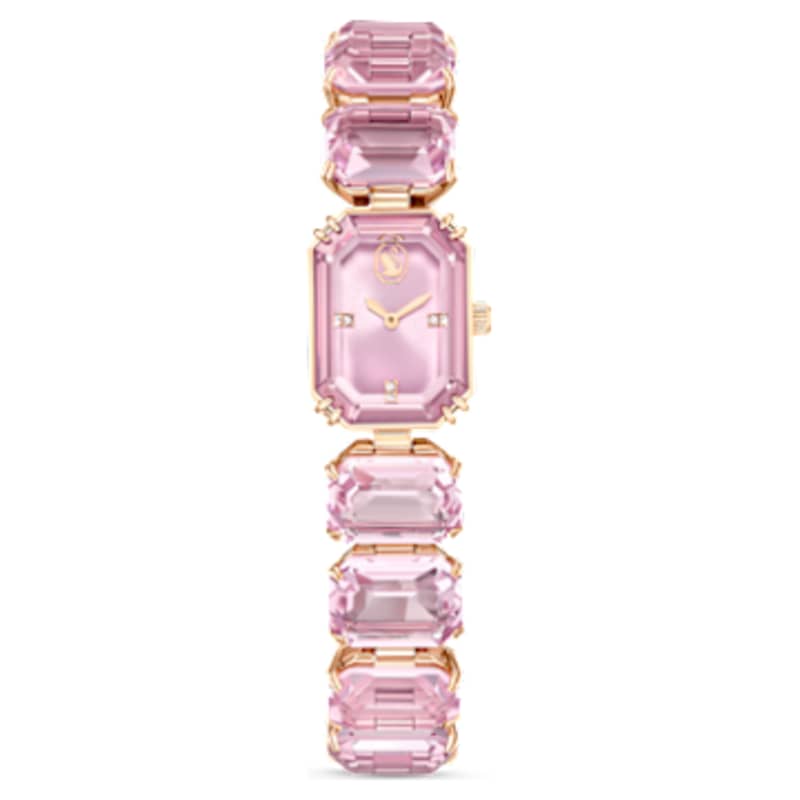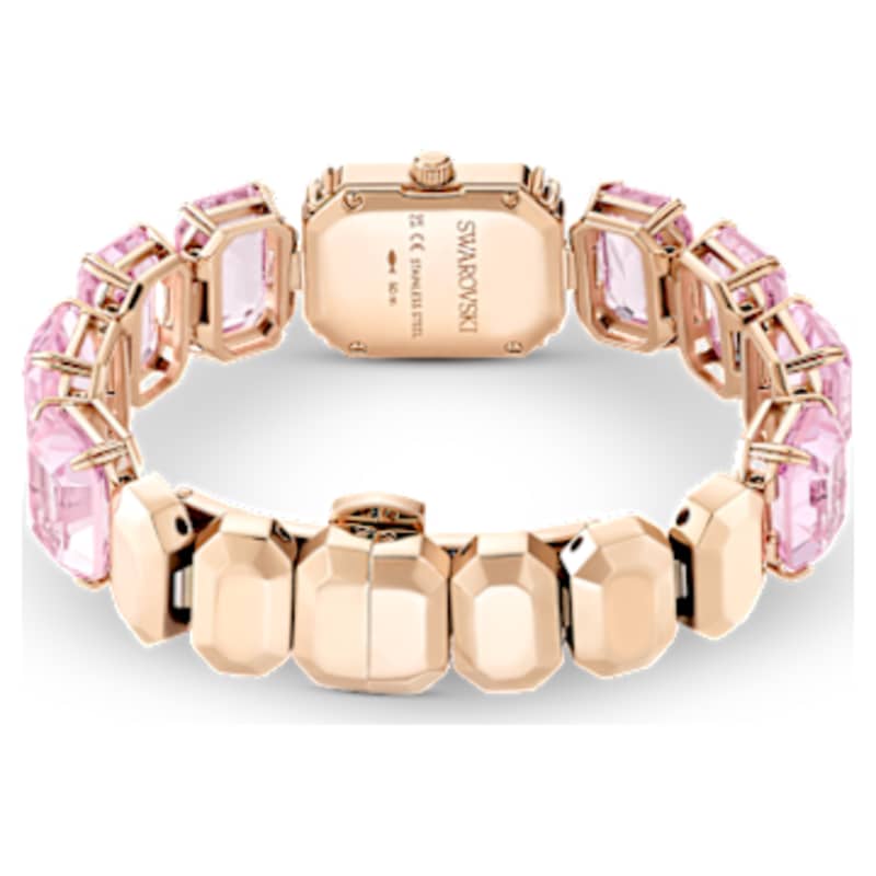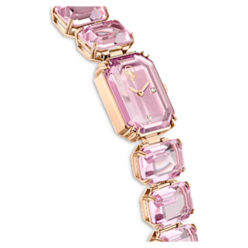 Inspirée par la famille Millenia, cette montre-bracelet attirante offre une touche de couleur irrésistible. Savamment conçue à partir d’une rangée de cristaux taille octogone d’une intense teinte rose, elle présente un cadran rose, une lunette cristallisée et une finition de ton or rose. Elle est étanche jusqu’à 50 m et constitue un choix malicieux portée seule ou en accumulation.