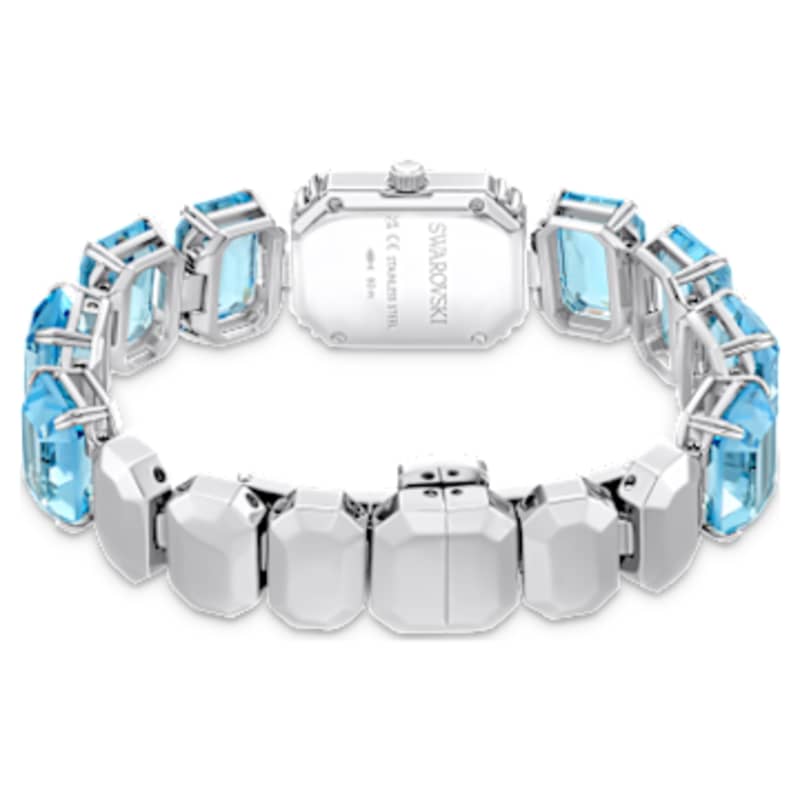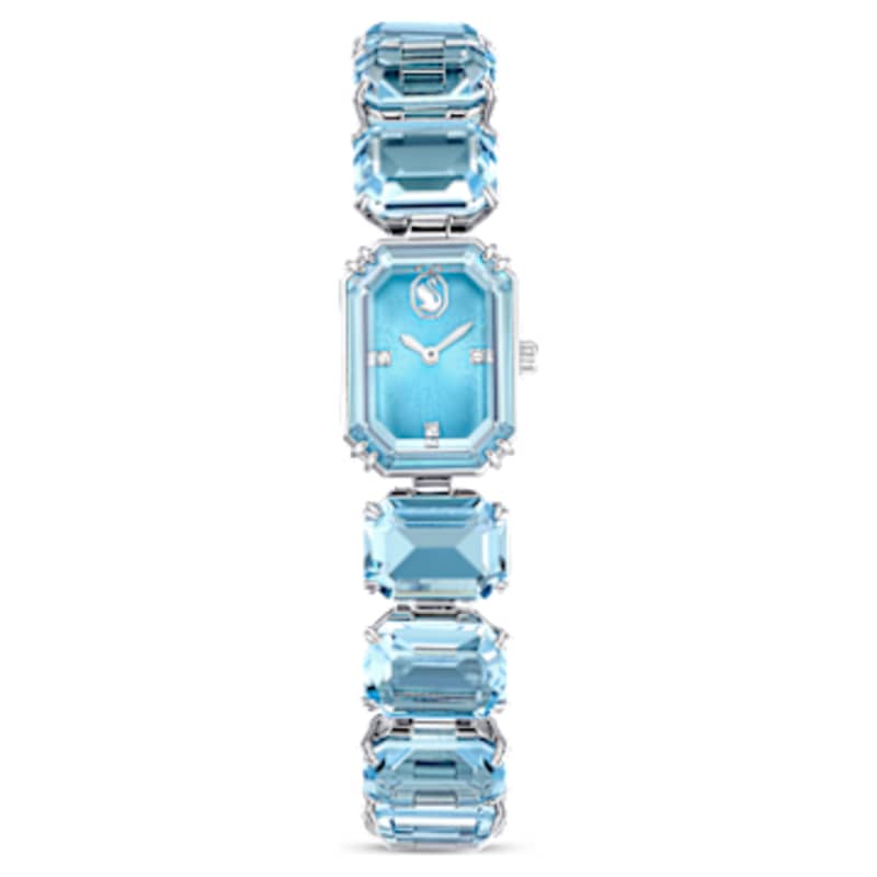 Inspirée par la famille Millenia, cette montre-bracelet attirante offre une touche de couleur irrésistible. Savamment conçue à partir d’une rangée de cristaux taille octogone d’une intense teinte bleue, elle présente un cadran bleu, une lunette cristallisée et une finition en acier inoxydable. Elle est étanche jusqu’à 50 m et constitue un choix malicieux portée seule ou en accumulation.