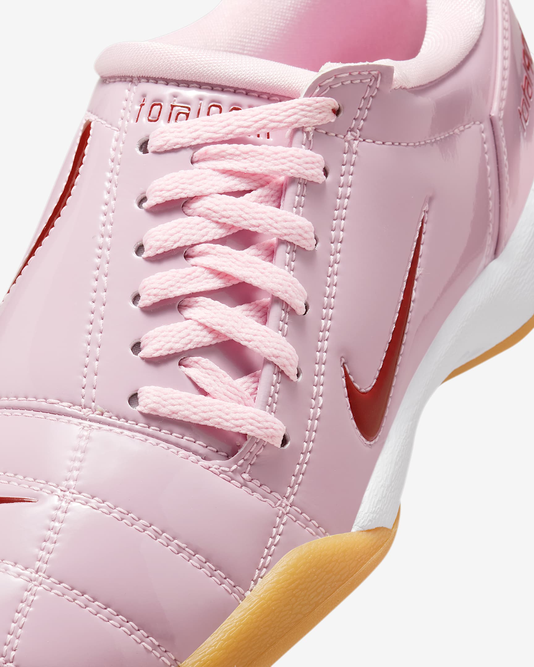La Total 90 est de retour, dans un look nostalgique des années 2000. Cette version conserve l’empeigne matelassée et le laçage asymétrique de la chaussure de foot d’origine. Ce qui change : on a remplacé la semelle à crampons par une semelle plate en caoutchouc, faite pour le quotidien.