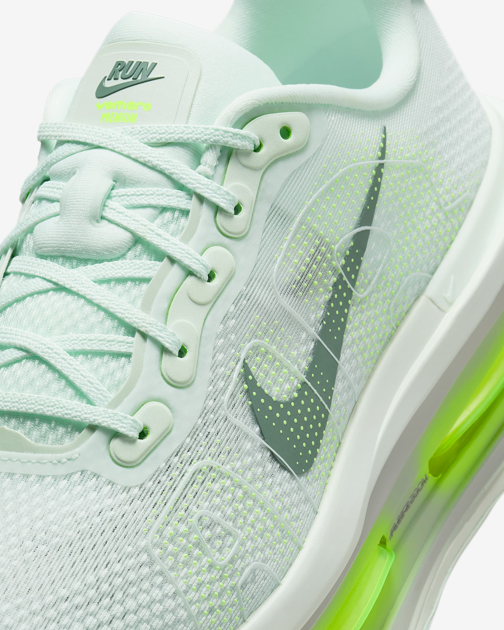Fais l’expérience de notre amorti maximal avec la Vomero Premium. Deux unités Air Zoom à retour d’énergie sont entourées d’une mousse ZoomX ultra-douce et réactive pour un confort ultime lors de tes runnings sur route quotidiens.