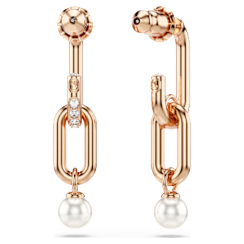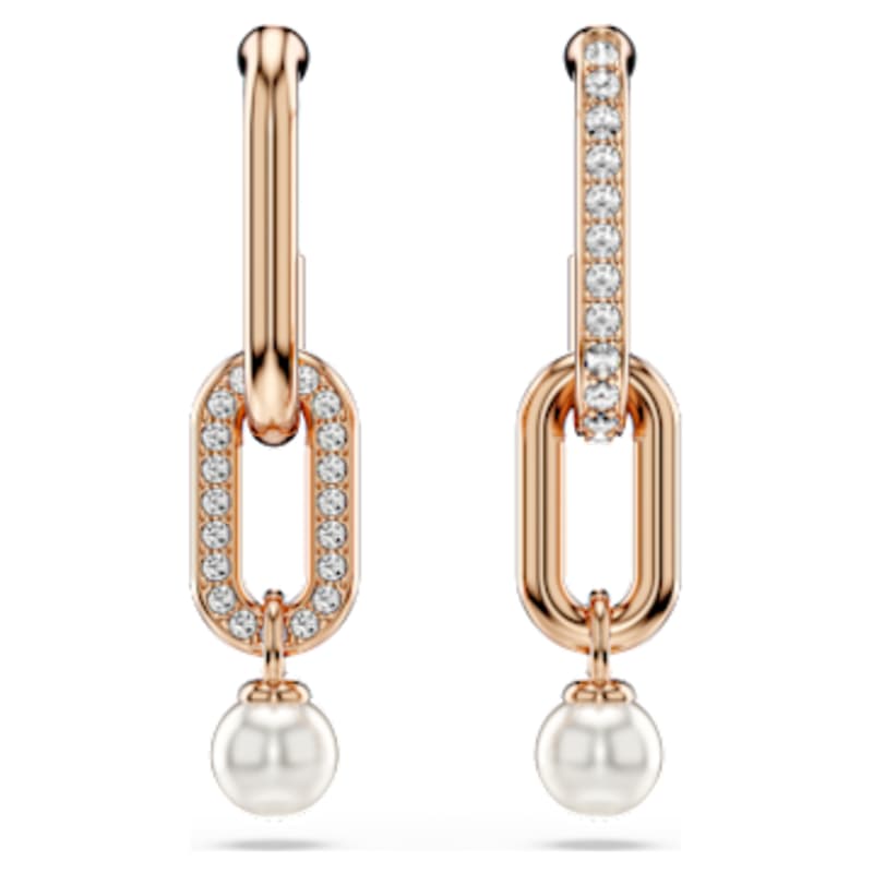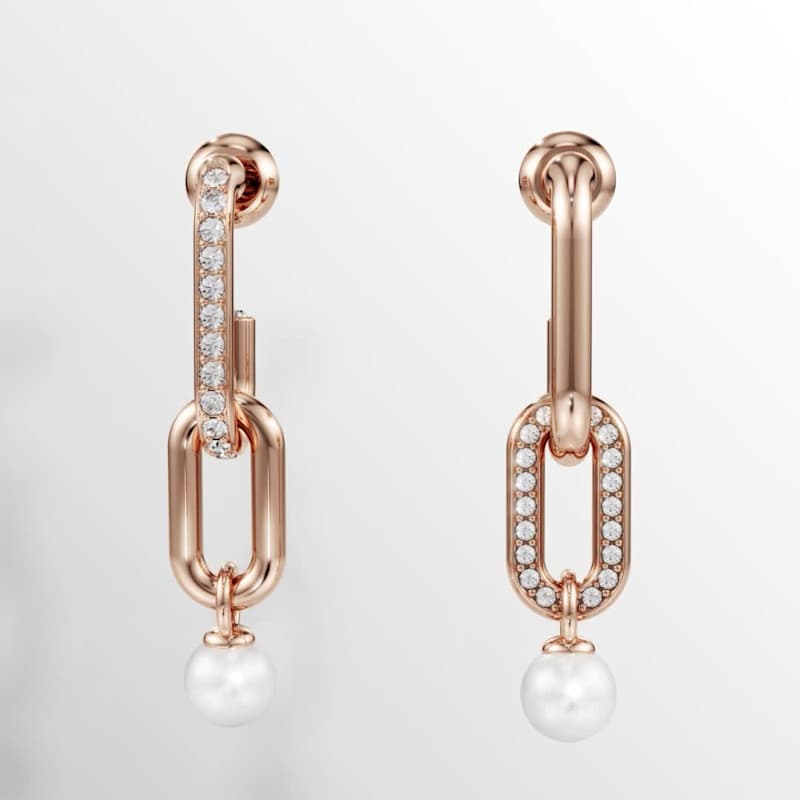 Ces boucles d’oreilles de ton or rosé élèvent l’élégance au rang d’art. Chaque pièce présente deux maillons entrelacés, ornés d’un pavé incolore, avec une unique Crystal Pearl Swarovski délicatement suspendue en dessous. Pour un look harmonieux, associez-les à un pendentif ou un bracelet assorti de la même famille.