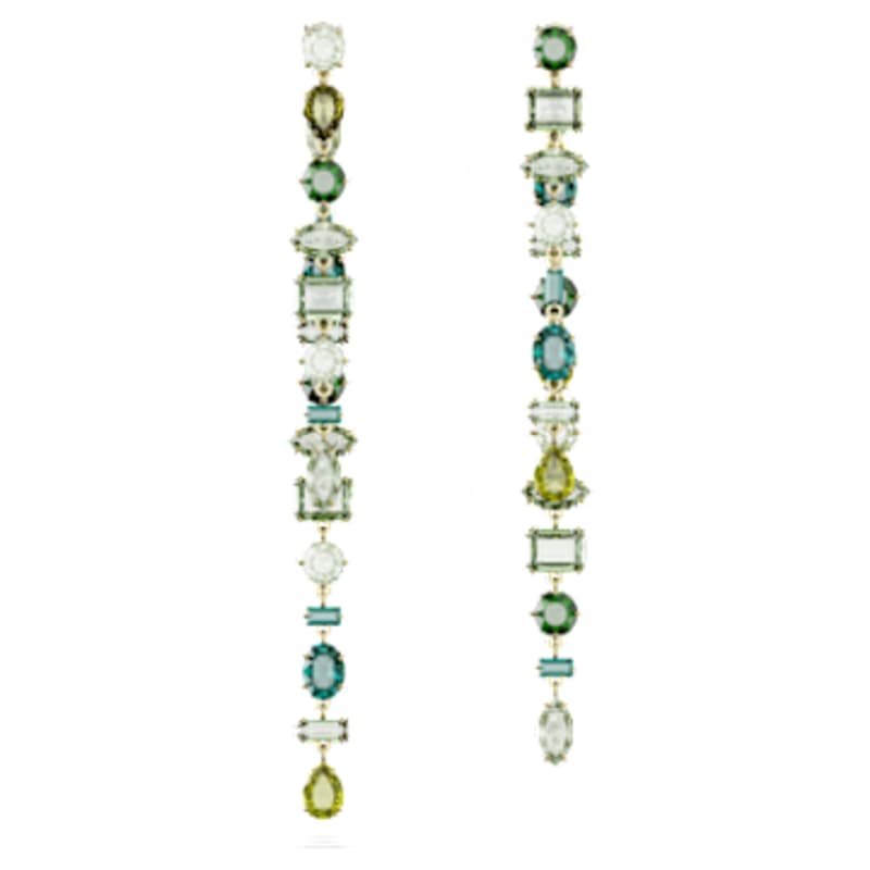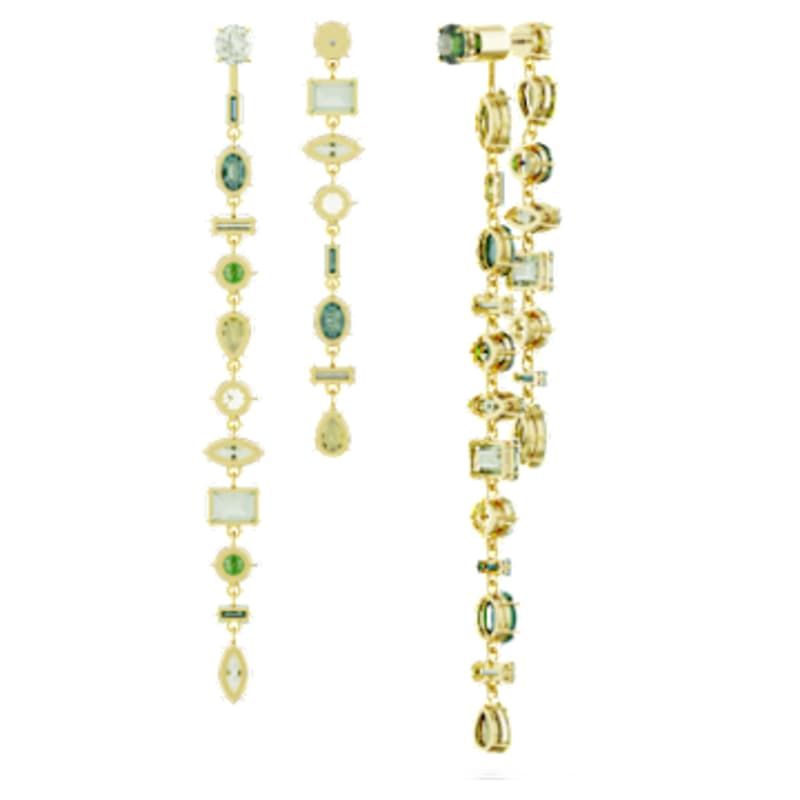 Inspirés par la nature, ces pendants d’oreilles s’habillent de nuances émeraude rafraîchissantes. Chaque boucle d’oreille est formée de deux rangées asymétriques de cristaux se déclinant dans un camaïeu de verts, sertis sur un placage de ton or. Une pièce bohème superbement conçue, parfaite à offrir ou à s’offrir pour se faire plaisir.