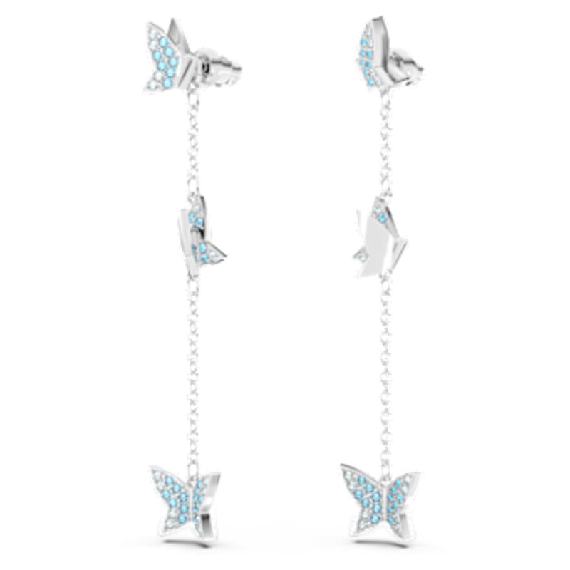 Prenez votre envol avec ces boucles d’oreilles papillons inspirées de nature. Suspendus à un motif de goutte en métal rhodié, les papillons capturent la lumière sous tous les angles grâce à leurs pavages bleus scintillants. À vous de choisir : ce bijou versatile peut également se porter sous forme de clous d’oreilles en détachant la chaîne tombante.