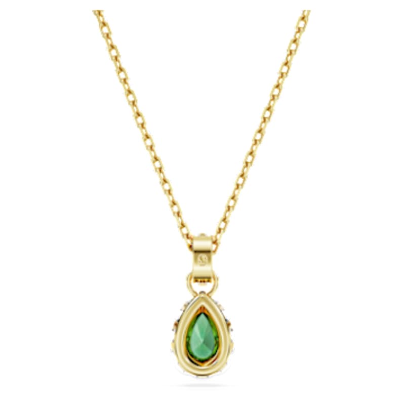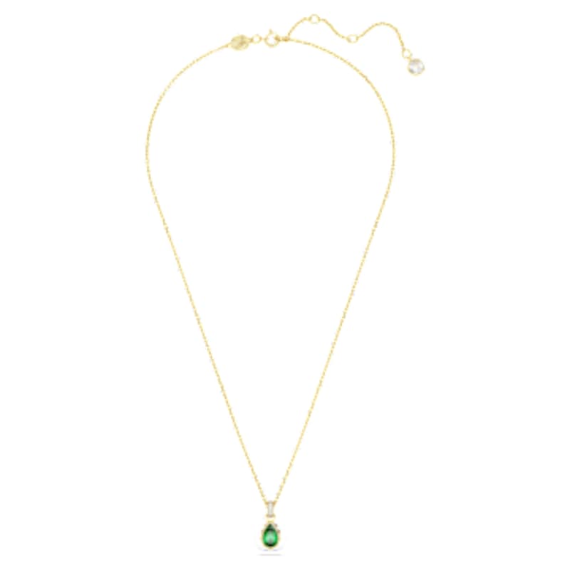Comme une goutte de lumière, ce pendentif de la famille Chroma présente une pierre centrale verte en forme de poire sertie sur un cadre en placage de ton or rehaussé de cristaux incolores carrés sur les bords et l’attache. Joliment attaché à une chaîne en placage de ton or terminée par une pierre ronde à une extrémité et doté d’une rallonge de 5 cm, cette pièce deviendra rapidement un incontournable de votre boîte à bijoux.