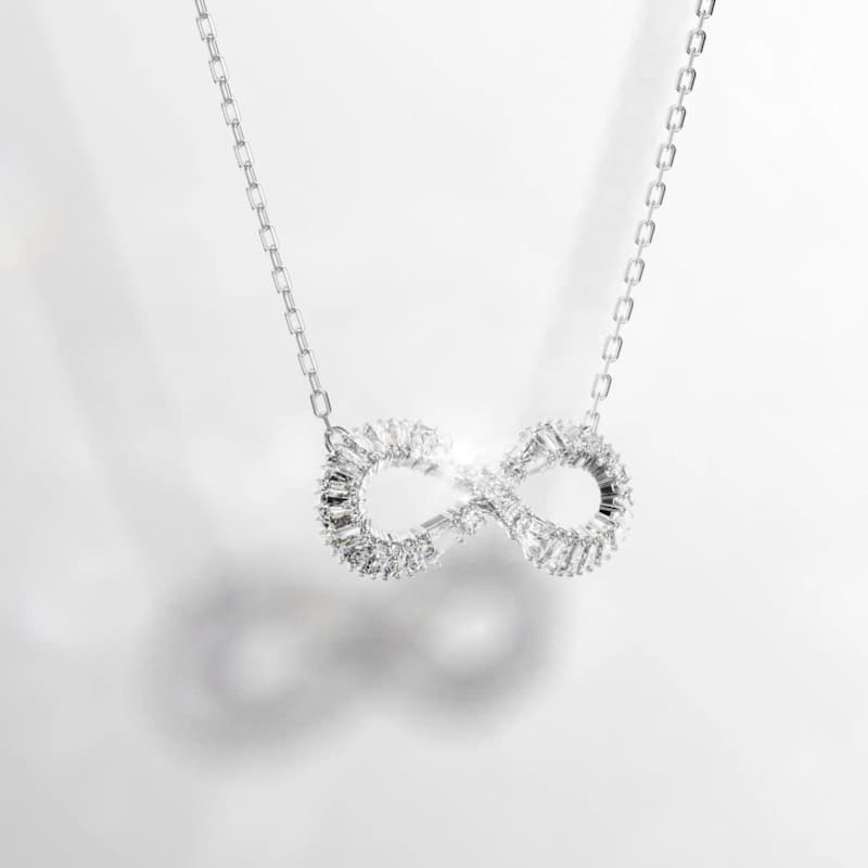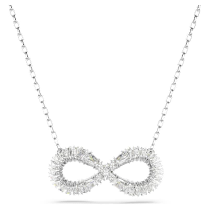 Adoptez un style intemporel avec ce brillant pendentif Hyperbola en forme de symbole de l’infini. Ce bijou en métal rhodié est suspendu à une chaîne délicate et son motif horizontal est orné de Swarovski Zirconia incolores. Un unique Swarovski Zirconia ponctue également l’extension pour une touche de raffinement supplémentaire. Un bijou parfait pour habiller votre style d’élégance au quotidien.