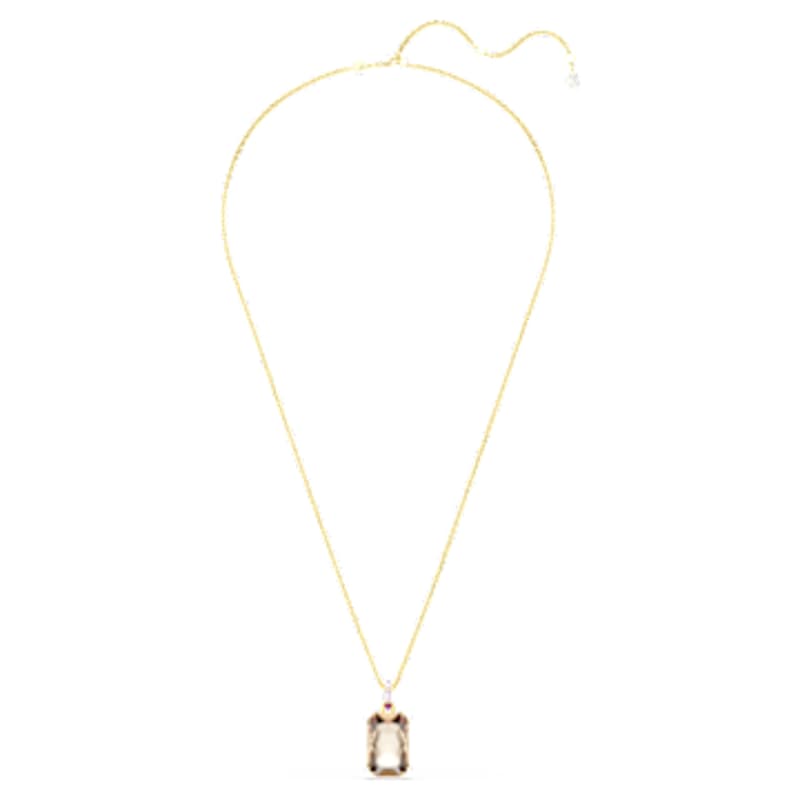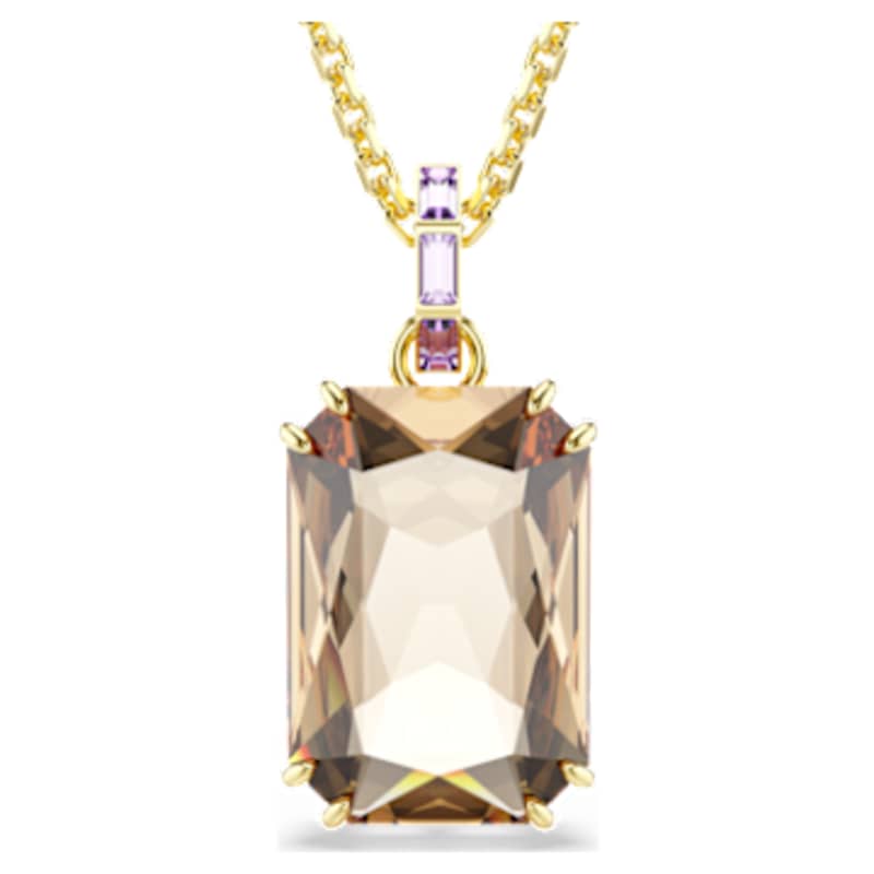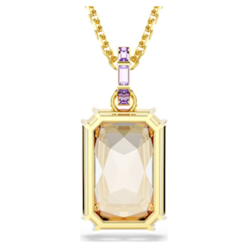 Ce pendentif Millenia éclatant est une création empreinte de chaleur et de luxe épurés. Le motif central, réalisé à partir d’un grand cristal couleur caramel serti doubles griffes, se connecte à la chaîne au placage de ton or par une bélière élégante ornée de cristaux violets sertis rail. Associez ce pendentif à une paire de boucles d’oreilles ou à un bracelet-jonc assortis pour un look ultra-moderne.