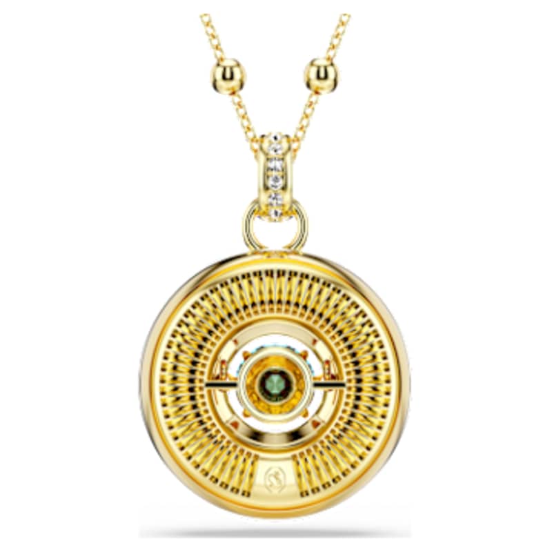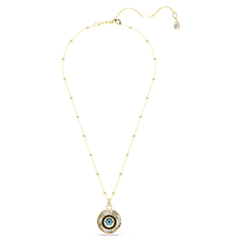 Jouez l’éclat et la positivité avec ce mystérieux pendentif Symbolica. Ce bijou au placage de ton or présente un étincelant motif de mauvais œil, composé d’un anneau externe facetté, d’un pavé noir et d’une pierre bleue dansante centrale. Suspendu à une chaîne perlée et relié à un petit maillon pavé, ce pendentif lumineux se dévoile aussi symbolique que magique et fascinant.