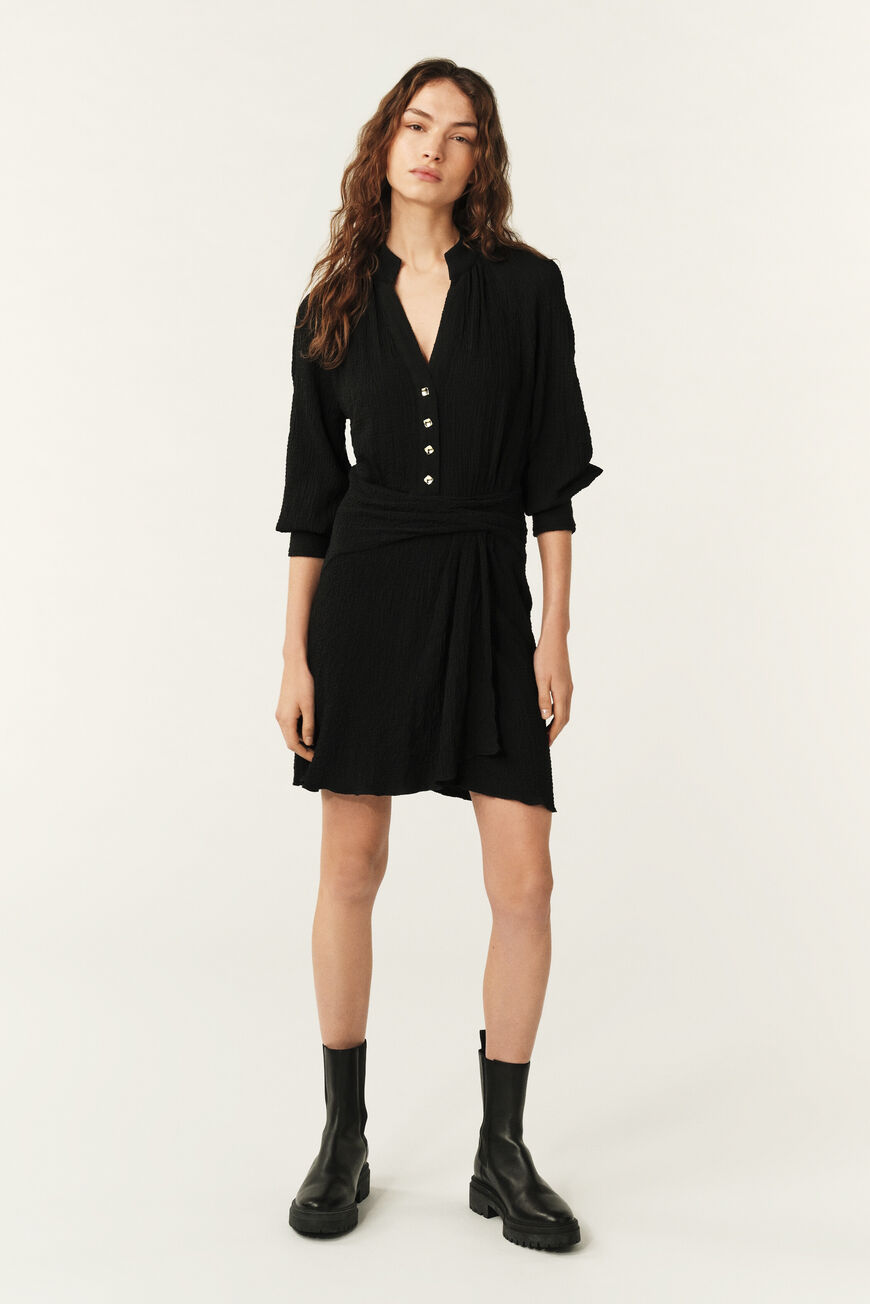 – Détail drapé asymétrique à la taille et au niveau de la jupe