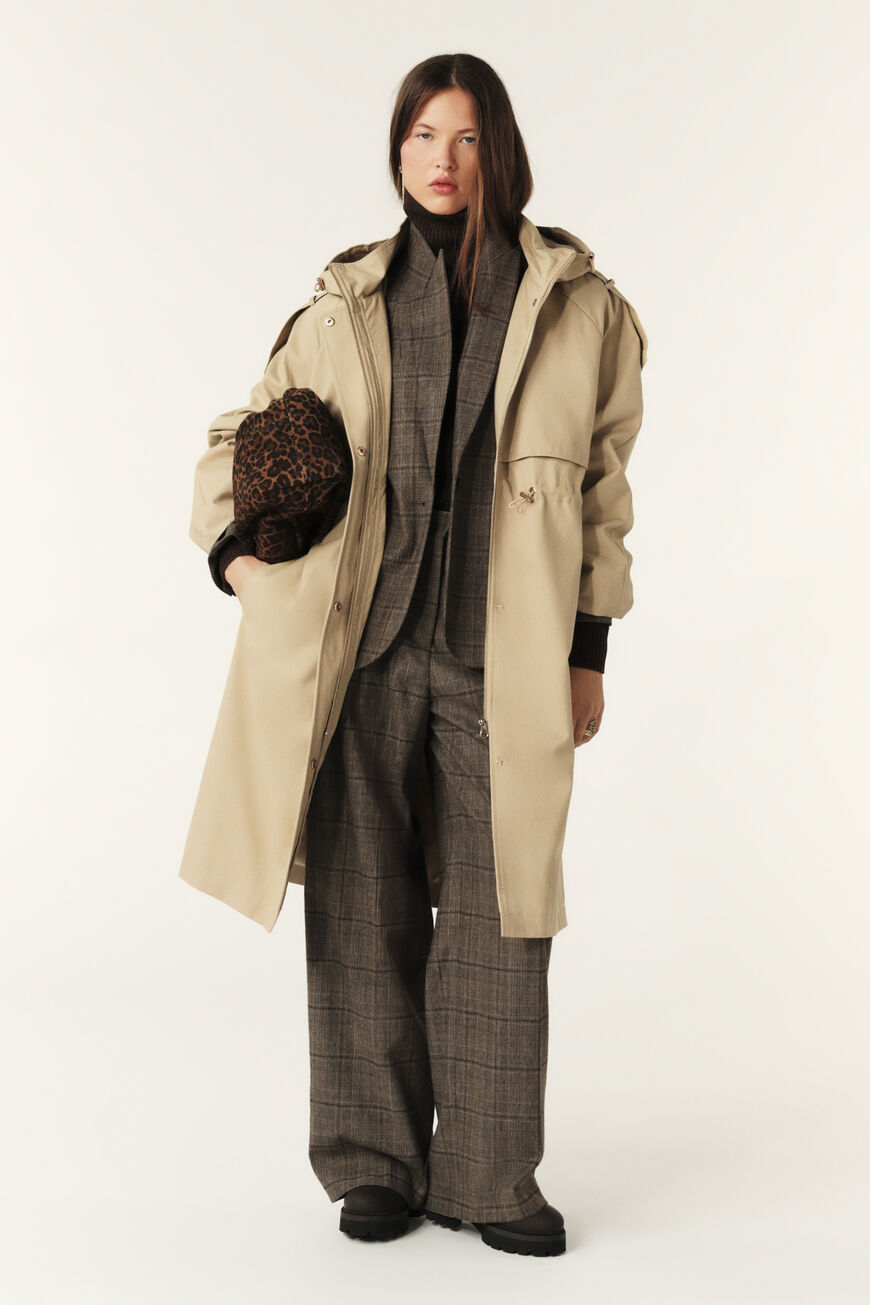 Le trenchcoat TED ba&sh est le vêtement incontournable de la mi-saison. Entre parka et trench, ce manteau adopte une coupe oversize. Il revisite les codes du trenchcoat dans un esprit urbain, avec un très grand bavolet qui descend jusqu’à la taille et des pattes de boutonnage très longues aux épaules. De la parka, il reprend la capuche bien couvrante avec lien de serrage, la double fermeture par zip et patte pressionnée, et il dispose d’un élastique à la taille pour marquer la silhouette. Le trench associe une belle matière et des finitions soignées. Une belle pièce originale et pratique, pour un look urbain stylé par tous les temps.